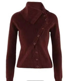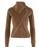 Designed for the modern woman who craves both comfort and sophistication, this mocha asymmetrical knit sweater redefines knitwear with its sculptural lines and architectural details. The diagonal placket, finished with tonal buttons, slices across the body to create an artful, figure-flattering effect. Its oversized fold-over collar adds drama and elegance, while the ribbed hem and cuffs provide subtle shape and balance. Rendered in a warm mocha hue, this piece is endlessly versatile — refined enough for the office when paired with tailored pants, yet equally chic with denim or leather for evenings out. The result is a knit that feels both timeless and ahead of its time, embodying understated luxury with every detail.