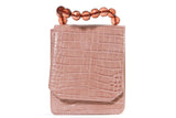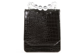 Front closure bag with chain strap for messenger use and tortoise like handle for purse handle.