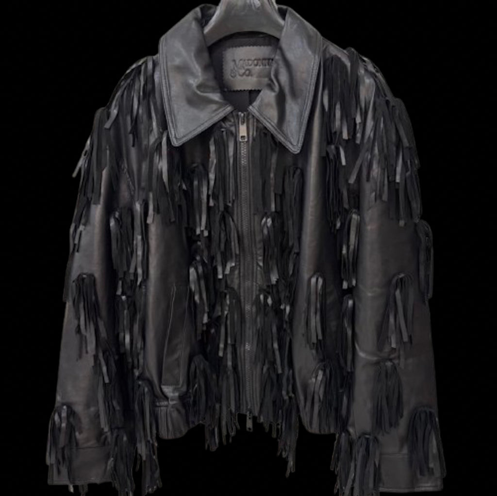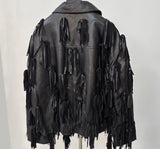 Smooth black leather, cascading fringe throughout, zip front, relaxed fit, fully lined.
