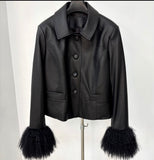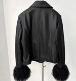 Smooth black leather, clean front closure, tailored body, dramatic textured cuff sleeves, fully lined.
