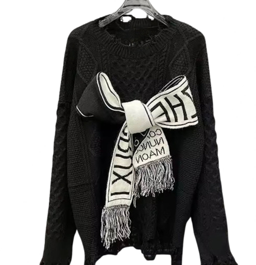 This exclusive M&C sweater redefines cozy sophistication with a bold, graphic twist. Crafted from a richly textured knit, the silhouette is relaxed yet refined, while the oversized detachable scarf—finished with fringe detailing—adds an unmistakable statement element.