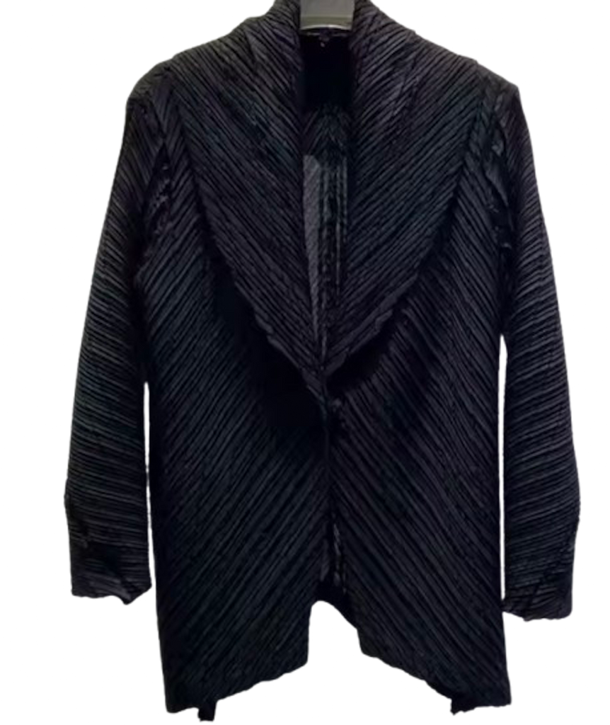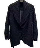 A statement layer with architectural edge. This textured knit jacket features a striking chevron pattern that creates movement and depth, giving a modern update to a classic silhouette. The open front and relaxed drape make it easy to throw on, while the structured texture elevates even the simplest look. Polished yet effortless, this piece works seamlessly from day to night, adding quiet drama and dimension to any outfit.