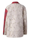 A masterpiece of rebellion and refinement, this deconstructed blazer is a wearable work of art. Crafted from dual-tone distressed jacquard, its split personality fuses muted ivory florals with deep crimson abstract prints. Asymmetrical lapels, raw-edge patchwork, and sculptural rose-like tucks add a hauntingly beautiful dimension to its silhouette. Structured yet subversive, this blazer is designed for those who dare to rewrite the rules, whether styled over a sleek slip dress or paired with slouchy denim and boots. Details: Mixed media jacquard with floral distressing. Sculptural, deconstructed tailoring. Oversized fit with asymmetrical front. Statement rose tucks and fabric slashes. Single-breasted button closure. Wear it when: you're ready to turn heads and challenge the conventional.
