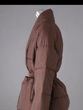 This isn’t just outerwear , it’s a silhouette. Crafted in a deep chocolate hue that feels indulgent yet grounded, this puffer coat combines functionality and elegance in a way that few winter staples do. The kimono-inspired wrap front creates a sculptural neckline, while the tonal buckle belt cinches the waist, defining the relaxed, oversized cut. Wide sleeves and padded quilting ensure warmth and ease of movement, while the cocoon-like structure envelops you in comfort. It’s designed for layering over chunky knits or sleek dresses, making it as versatile as it is chic. Perfect for city streets, après-ski escapes, or simply elevating your everyday winter look, this coat transforms cold-weather dressing into an act of confidence and style.
