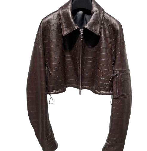 The front zip fastening, side pocket zip, and crop silhouette are fully lined.