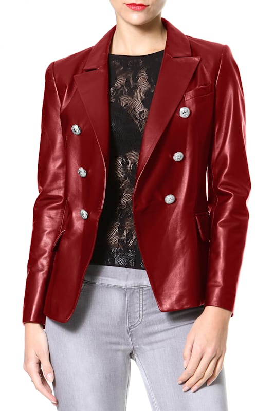 Double-breasted leather blazer, gold buttons, fully lined.