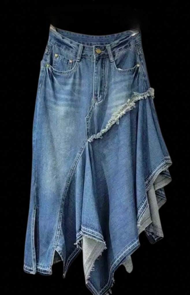 This seasonless skirt transforms the art of denim into movement. The asymmetrical tiers and raw edges create an effortlessly draped silhouette that feels modern and free-spirited. Designed with subtle structure at the waist and soft fluidity through the hem, it flatters every shape while adding a touch of rebellion. Each detail, from the pieced panels to the frayed seams, speaks to authentic craftsmanship and individuality.