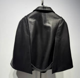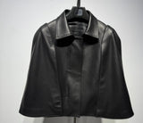 A new silhouette for the modern wardrobe. This black leather capelet combines the drama of a cape with the ease of a jacket. Designed with sleek arm openings, it offers effortless movement while maintaining its sculptural shape. The structured collar and clean lines frame the body in sharp sophistication, while the supple leather drapes with fluid elegance. A statement in versatility, it slips easily over everything from tailored trousers to evening dresses—bringing instant impact to every look.