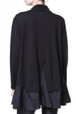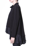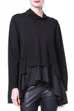 Pullover style, loose fit, hi-lo woven ruffle hemline.