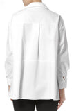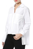 Button front, long sleeves with button cuff, hi-lo hemline.