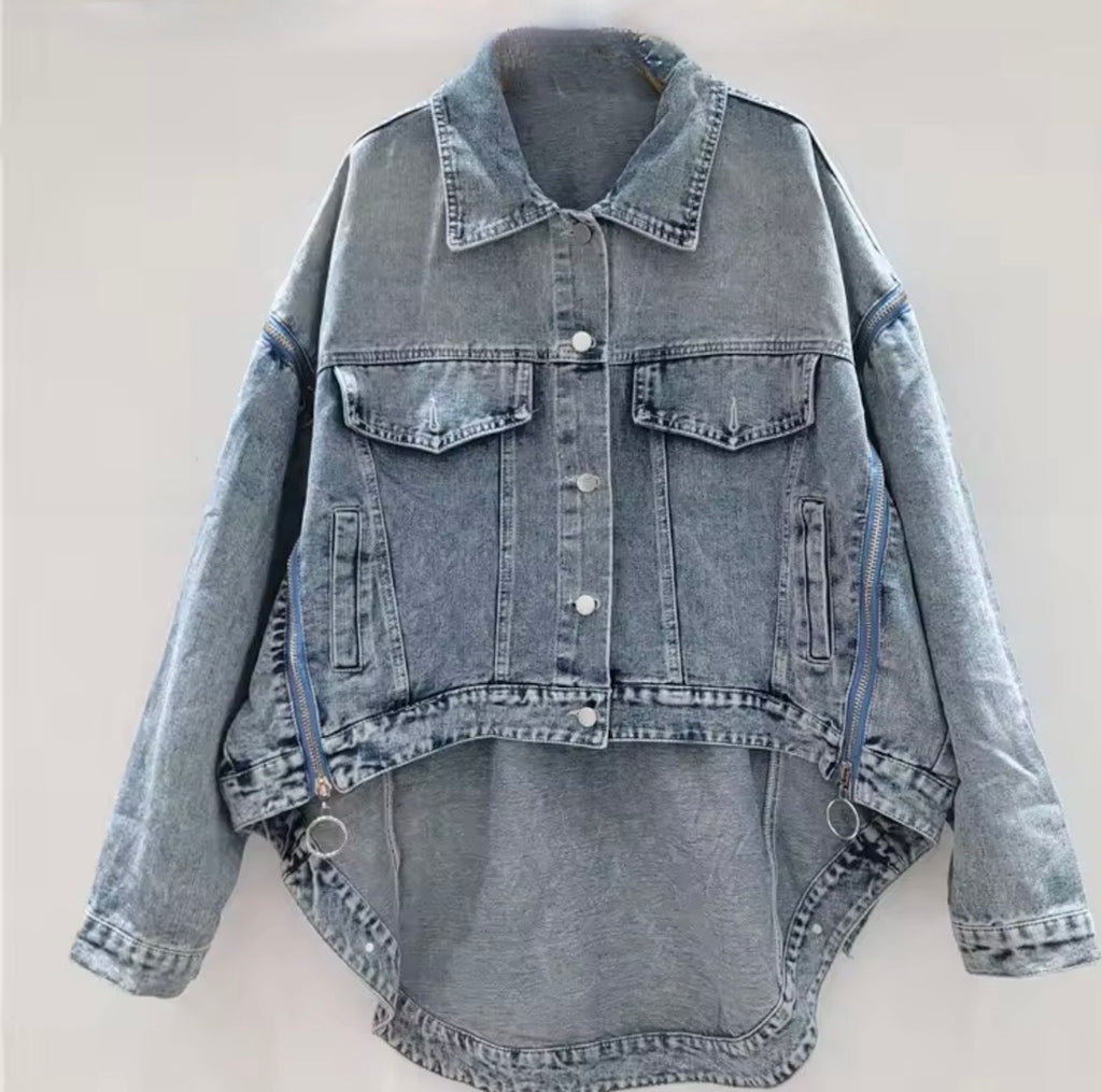Redefine denim with this ultra-cool, asymmetrical oversized shirt-jacket. Designed with a classic washed finish and elevated by directional details, this piece features a dramatic high-low hem that lends it a runway edge. Silver snap buttons, a functional flap, and welt pockets, along with exposed zipper accents and statement ring pulls, add a modern, utilitarian vibe. The drop shoulders and relaxed fit bring effortless street-style energy, while the unique rear zipper detail adds a twist of rebellion. Perfect for layering over anything from leggings to slip dresses, this jacket is where classic meets unapologetically bold.