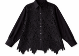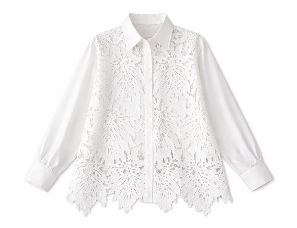 This exclusive M&C blouse blends timeless romance with modern refinement. Featuring an intricately detailed lace front panel and soft, long sleeves, the silhouette falls effortlessly into a delicate scalloped hem.
