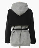 Single-breasted, zip front with an attached knit hood, fully lined.