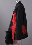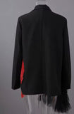 Command attention in this couture-inspired black blazer that fuses tailored structure with avant-garde artistry. Cut in a double-breasted silhouette with strong shoulders and a notched lapel, this piece strikes a balance between traditional and fearless. The standout feature is a vivid, oversized red koi fish, meticulously embroidered in 3D threadwork, symbolizing strength, transformation, and good fortune. Its flowing fins ripple across the body, wrapping from front to side with a sense of movement and life. On the opposite side, sheer black tulle cascades asymmetrically from the shoulder and hem, layered in romantic pleats and voluminous ruffles that add drama and softness to the sleek structure. The blazer closes with two polished silver-tone buttons, while the mixed-media elements make this a wearable work of art. Perfect for gallery openings, editorial styling, or simply commanding every room you enter, this is a statement piece for the bold, the visionary, and the unapologetic!!
