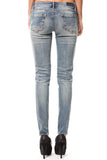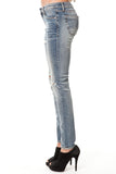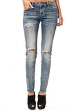 Ultra flattering and comfortable skinny mid-rise jean with distressed details.