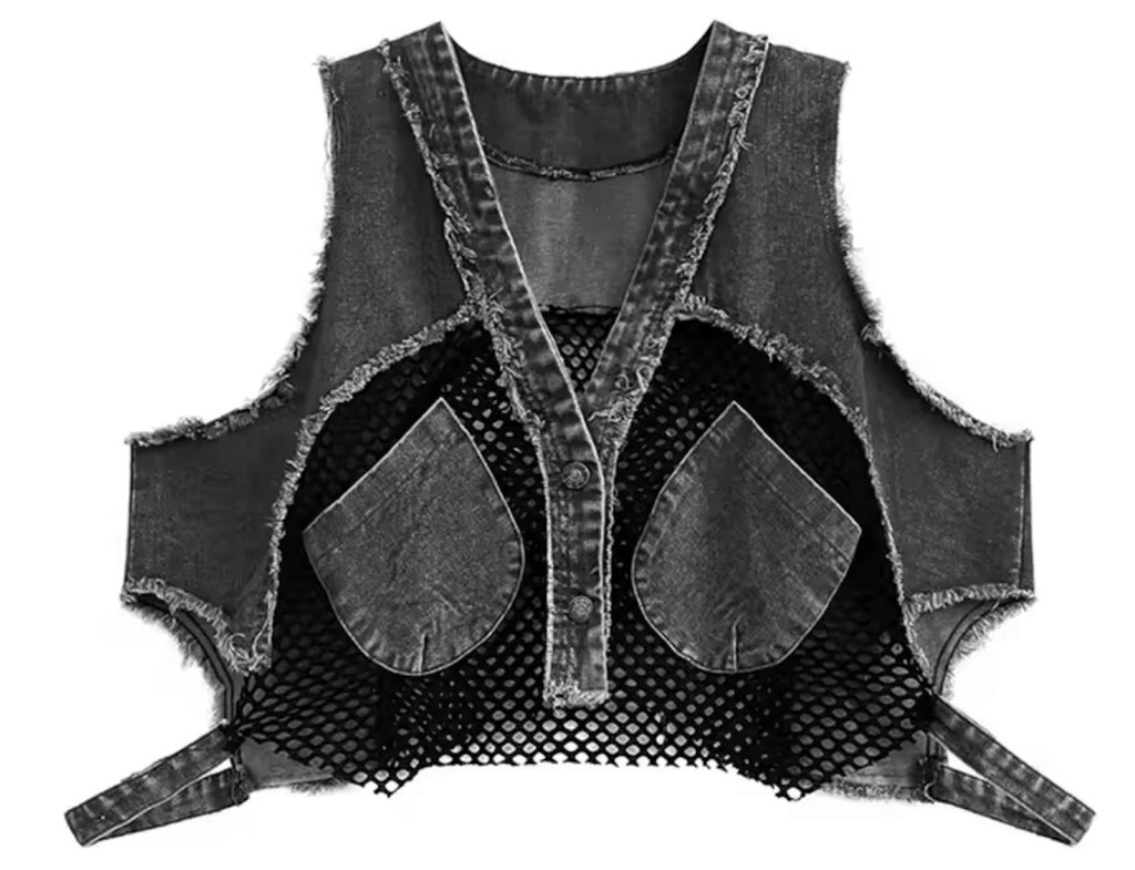 Frayed denim vest with mesh insets and oversized utility pockets.