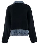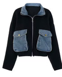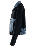 Effortlessly blending utilitarian design with a high-fashion twist, this black zip-front jacket makes an undeniable statement. Crafted in a structured silhouette, it features oversized denim cargo pockets that are both functional and eye-catching, paired with a sharp denim collar that adds contrast and attitude. The ribbed hem and cuffs give it a touch of structure, balancing its relaxed fit for easy layering. Whether styled with sleek leather pants, wide-leg trousers, or a flowing midi skirt, this piece carries you from casual daytime looks to elevated night-out ensembles. Equal parts streetwear and couture, it’s a wardrobe investment that instantly upgrades your style game.