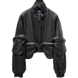 This exclusive M&C biker is a cool alternative to the standard leather jacket - it's one of those investments that you'll still love years from now. This piece is impeccably made from textured leather treated with oils for utmost softness. Meet your new obsession: the Utility Luxe Leather Bomber, a high-impact fusion of streetwear attitude and couture craftsmanship. Cut from supple, premium genuine leather, this sculptural jacket is a statement in silhouette and utility. The exaggerated cargo pockets aren't just bold , they're beautifully chaotic, lending architectural edge and functional fashion all at once. Zippered details slash across the front like armor, while the high funnel neck and voluminous sleeves bring undeniable runway energy. Cropped to perfection with elasticized cuffs for a cinched finish, this piece turns heads from every angle. Whether styled with slouchy trousers, a body-hugging mini, or thrown over a sheer dress, it’s the power piece your wardrobe has been waiting for. Wear it loud. Wear it unapologetically. This is luxury with bite.